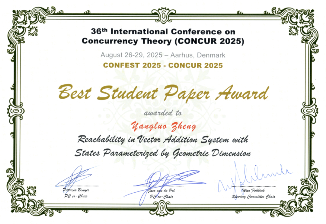 CONCUR全称International Conference on Concurrency Theory,是聚焦于并发计算系统理论的知名国际会议。该会议自1990年起已连续举办36届。这是亚洲学生首次获得该会议最佳学生论文奖。