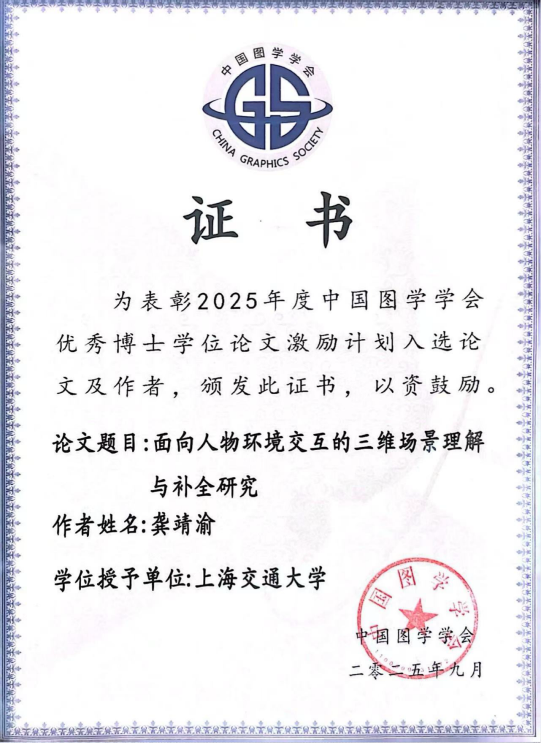 中国图学学会(CGS)是国家一级学会,其前身是中国工程图学学会,是中国科学技术协会的组成部分。学会始终围绕图学及相关学科,推进学术研究,开展国内外学术交流,促进图学科学普及,积极为科技工作者服务。“中国图学学会优秀博士学位论文激励计划”是为推动中国图学领域的科技进步,鼓励创新性研究,激励本领域的博士研究生研究生潜心钻研、务实创新,解决图学领域中需要解决的理论和实际问题而设立。2025年度中国图学学会优秀博士学位论文激励计划于今年6月启动,经推(自)荐、资格初审、答辩人答辩、专家现场评审和会评审查等环节,最终5篇论文入选2024年度中国图学学会优秀博士学位论文激励计划。