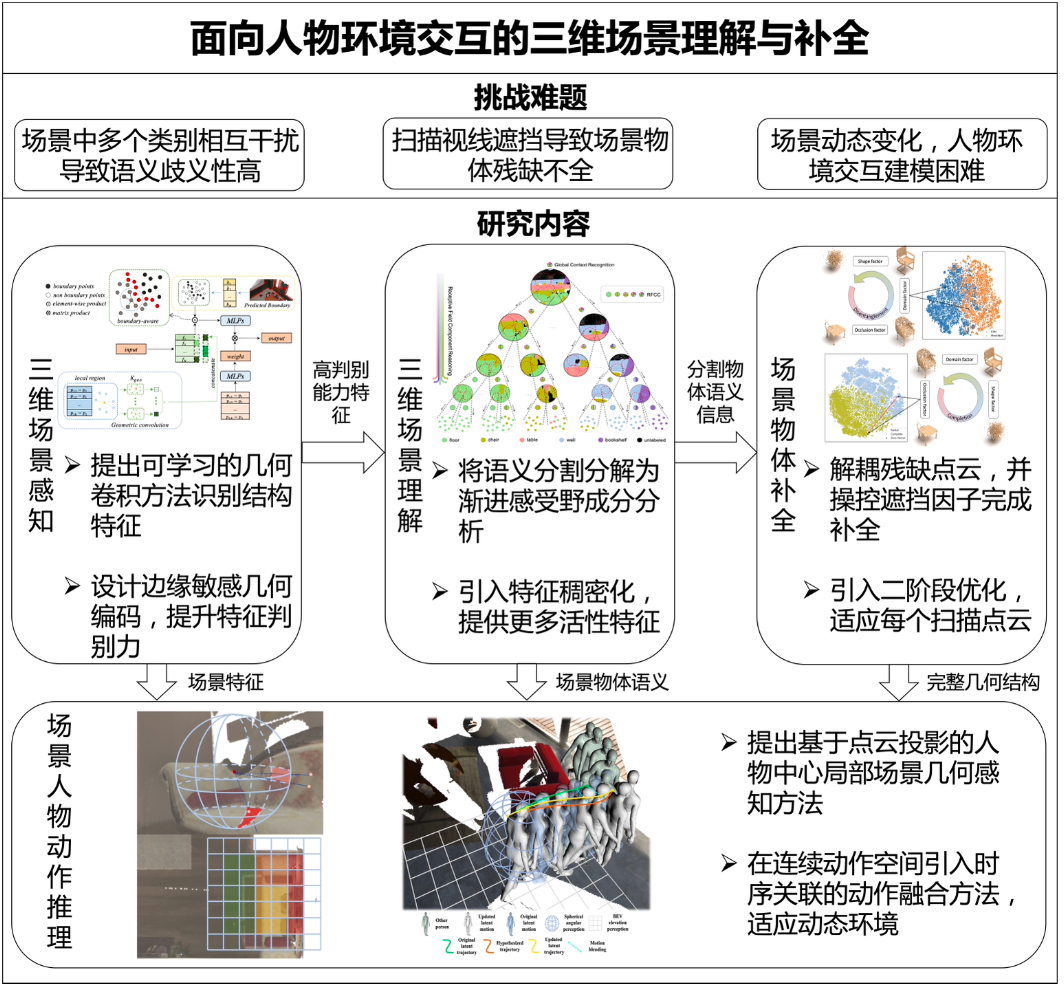 龚靖渝的博士学位论文面向人物环境交互,针对当前三维场景理解歧义性高、扫描物体残缺不全、场景人物交互建模困难等问题开展研究。该学位论文针对三维场景语义理解问题,提出边缘敏感的几何编码方法以及渐进感受野成分分析监督方法,提升了场景语义分割的性能;针对真实扫描物体残缺的问题,提出将任意的残缺点云解耦为遮挡因子、域因子以及域无关的形状因子,提升了真实扫描物体的形状补全能力;针对动态场景人物环境交互建模问题,提出基于投影的场景感知及隐空间的时序关联动作融合方法,实现了动态场景下的人物动作推理。相关成果发表在CVPR、ECCV、AAAI、TPAMI等顶级会议期刊上。