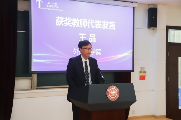 章璞、王品代表获奖教师发言。章璞老师表示,教学是我们终生的事业,帮助学生在知识和能力两方面不断地成长,是我们最高的价值。提升教学能力,丰富课程内容的前沿化和含金量、提高教学效果,我们永远在路上,只有进行时,没有完成时!王品老师表示,教师应当将自己的知识和学养,以切实有效的方式传递给学生,并鼓励学生创造、发展。希望我们的课堂能够给予同学们乐于求知的欲望、追寻理想的动力和丰富内心的情怀。
