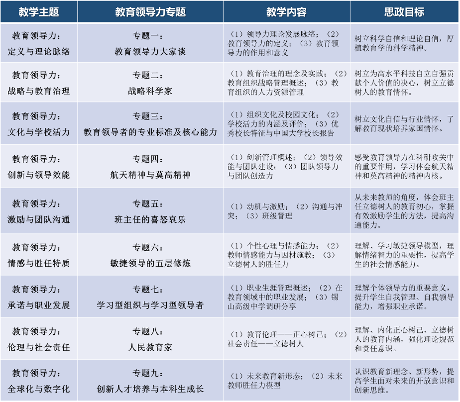 《教育领导力》课程坚持专题化课程设计与学生自主式提升相结合,通过原理引导、案例分析、实践问题,带领学生学习、掌握教育领导力的基本原理与方法,以涵养教育初心、坚定道路自信、强化使命担当、激发职业责任感的思政教育目的,具体主要体现在以下三个方面: