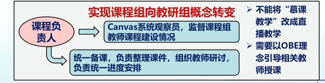 首先,施行课程负责人负责制度,在canvas中将其他老师列为课程观察员,统一备课、组织研讨,监督课程组教师,实现从课程组向教研组的概念转变。