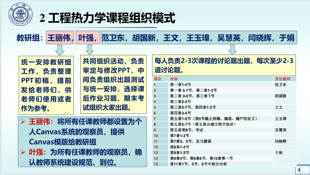 其次,教研组一定要协同工作,比如在这门课程中,王丽伟老师和叶强老师是教研组负责人,要负责统一安排教研组工作,负责整理和修改 PPT,并提前发给老师们,以及负责组织出题测试与统一安排,选择课后作业习题,共同安排期末试题等。