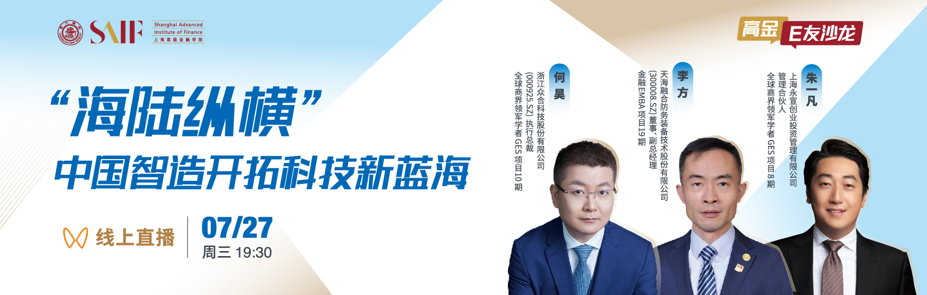 7月27日,高金E友沙龙第3期邀请到浙江众合科技股份有限公司(000925.SZ)执行总裁、全球商界领军学者GES项目10期校友何昊,天海融合防务装备技术股份有限公司(300008.SZ)董事、副总经理、金融EMBA项目19期校友李方,上海永宣创业投资管理有限公司管理合伙人、全球商界领军学者GES项目8期校友朱一凡,共同探讨“海陆纵横”中国智造开拓科技新蓝海。