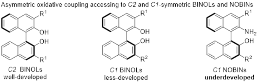 联萘骨架化合物广泛存在于具有生理活性天然产物和药物分子中,并且作为手性催化剂、功能材料在不对称催化领域中得到广泛的应用。近年来,手性NOBIN在不对称催化领域发挥了越来越重要的作用,研究表明在NOBINs结构中3,3'-取代基的电性及位阻效应对手性调控影响较显著。然而,与具有C1-对称性的手性BINOL类化合物相比,通过不对称催化方法合成NOBIN类化合物的发展仍较为缓慢。目前手性NOBINs化合物的合成主要通过手性底物诱导以及动力学拆分。在构筑手性化合物中,氧化交叉偶联是最直接,高效的一种策略。因此,通过氧化交叉偶联的策略构建具有3,3'-双取代基的手性NOBINs是一项极具挑战的工作。