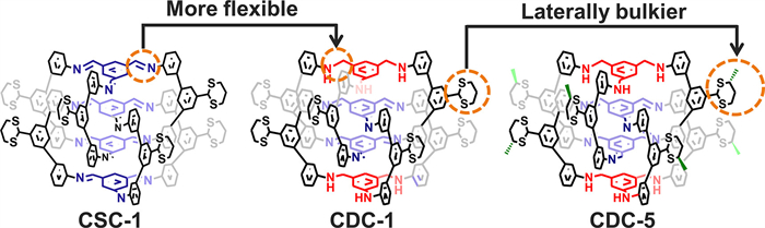 研究人员选取了结构上具有细微差别的三种互锁分子笼,CSC-1具有四个刚性亚胺键连接的苯环面,CDC-1外侧的苯环面则通过柔性的胺键连接,CDC-5则在CDC-1基础上进一步在侧边引入了六个甲基,从而增大空间位阻。(图1)