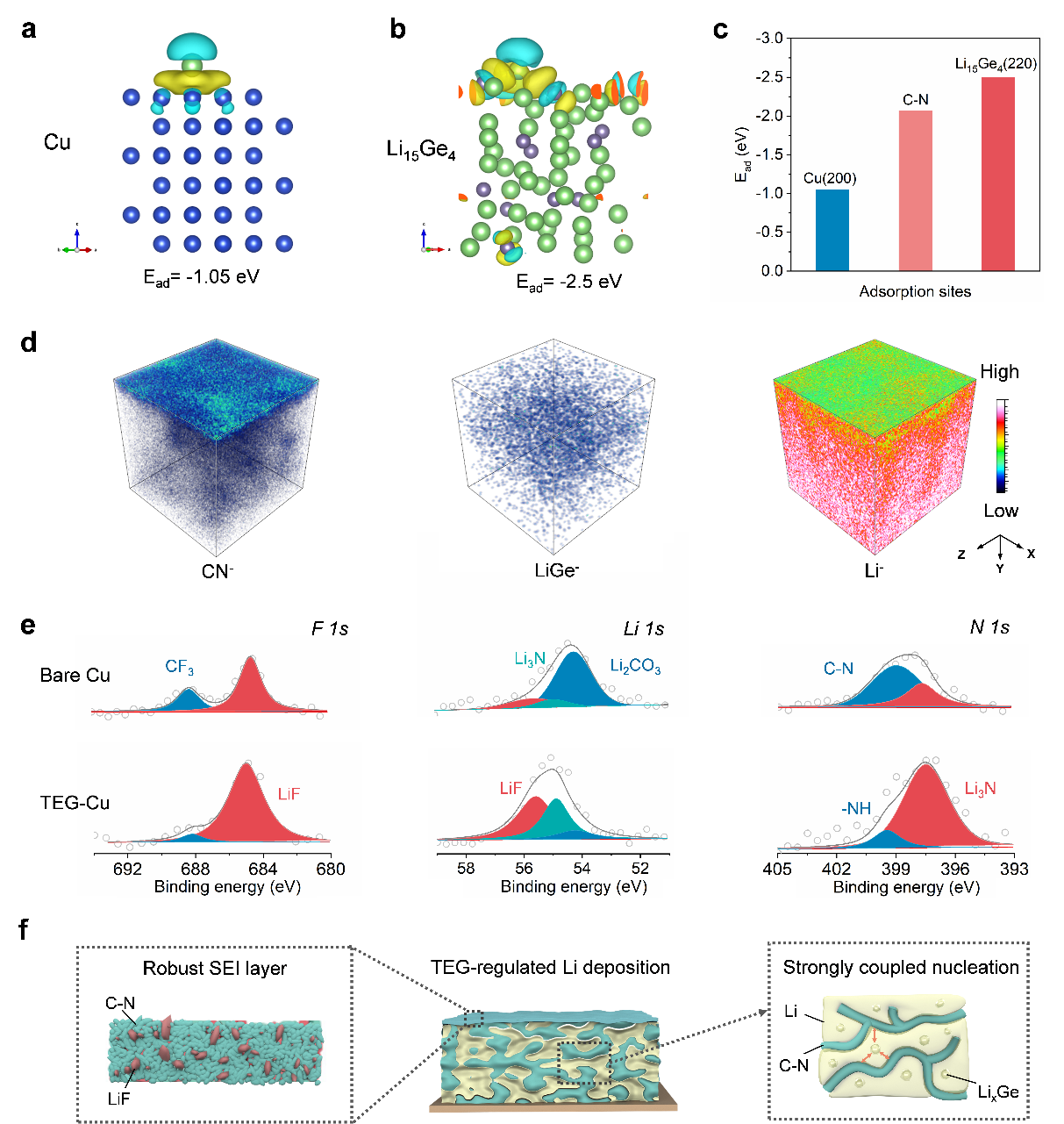 研究团队通过密度泛函理论(DFT)、飞行时间二次离子质谱(TOF-SIMS)和X射线光电子能谱(XPS)深入探究了TEG调控锂金属沉积与剥离过程的科学机制。DFT计算结果证实了TEG界面层诱导产生的LixGe合金和有机C-N组分对锂离子具有较强的吸附能,这种亲锂性的骨架能够诱导锂的成核和均匀生长(图4a-c)。TOF-SIMS表明了负极界面外表面均匀分布了C-N,而由TEG界面层衍化产生的LixGe合金和锂金属均匀分散在内部,再次证实了两者较强的耦合作用(图4d)。XPS进一步揭示了该界面层诱导形成富含氟化锂(LiF)和氮化锂(Li3N)的界面钝化层,这也显著改善了锂沉积剥离的可逆性(图4e-f)。上述结论有望为无负极电池性能的进一步提升提供关键的理论支撑。