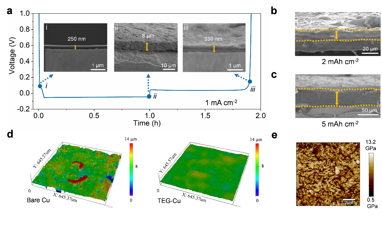 通过扫描电子显微镜确认了TEG界面层在锂金属沉积与剥离后的可逆的体积变化。同时结合激光共聚焦显微镜测试,证实了TEG界面层的引入使得铜表面的锂金属沉积层更加均匀致密(图3a-d)。原子力显微镜测试结果表明界面层引入后使电极和电解液相界面的力学强度显著增强,这也为该界面层能够有效缓解锂金属沉积剥离引起的体积变化提供了关键的实验证据(图3e)。