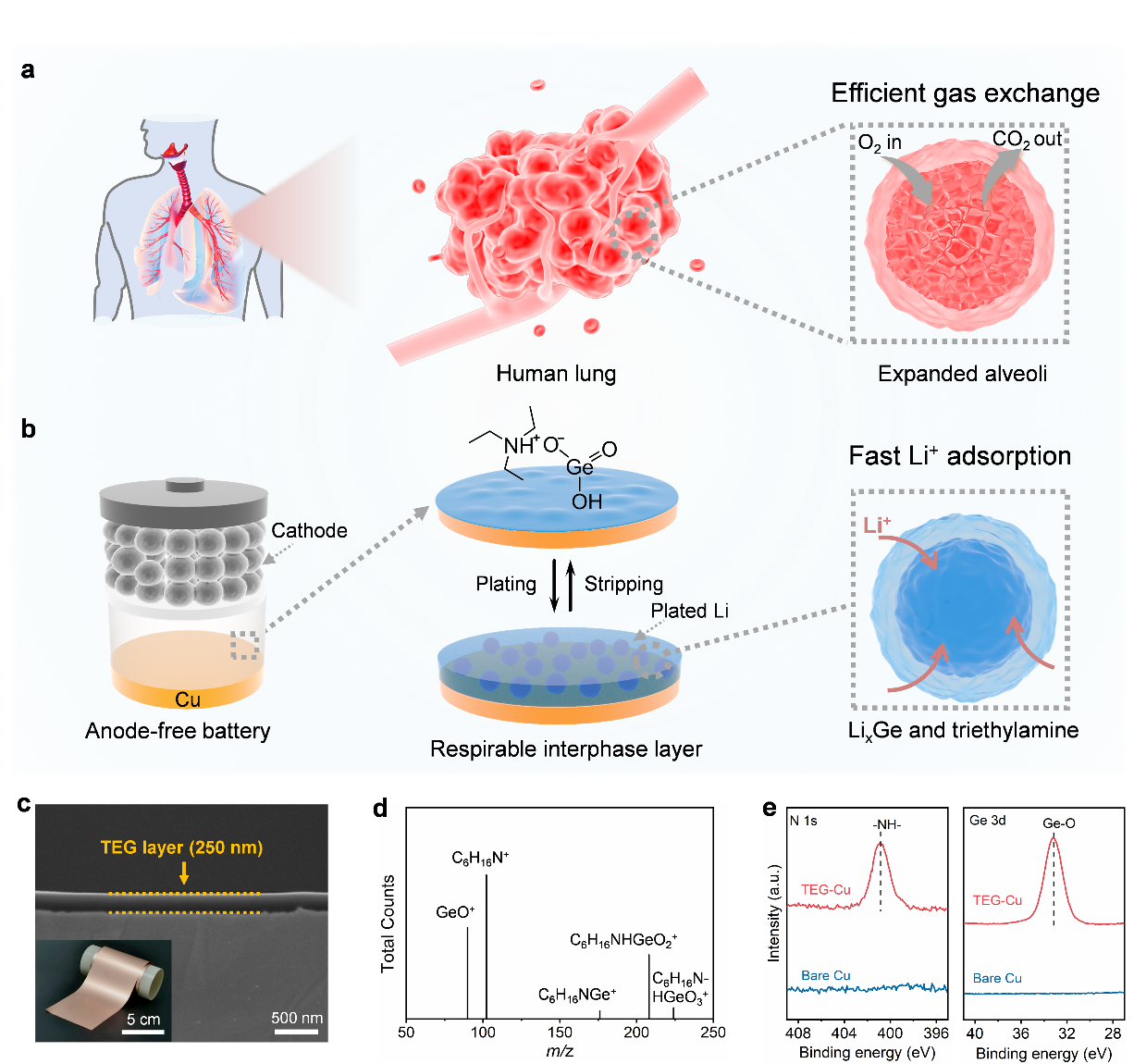 鉴于此,欧宝app官方网站下载变革性分子前沿科学中心孙浩副教授团队与复旦大学高分子科学系彭慧胜教授团队开展合作,通过借鉴人体肺泡在呼吸过程中的可逆体积膨胀/收缩进而实现物质和能量高效传输这一独特机制,提出了一类“可呼吸式”的超薄界面层。该界面层(三乙胺锗酸盐,TEG)的设计优化显著改善了锂离子的吸附、成核和沉积过程。锂金属的沉积和剥离过程表现出可逆的膨胀和收缩,并具有优异的电化学可逆性(库伦效率99.3%)。基于此获得的无负极电池,在3 mAh cm-2的高面容量条件下能够稳定循环250圈(平均库伦效率99.4%),突破了已有报道的最高水平。该界面层超薄(~250 nm)和超轻(~0.05 mg cm-2)的特点也显著提升电池的能量和功率密度(分别达到527 Wh kg-1和1554 W kg-1),为推动无负极锂金属电池的实用化提供了全新的思路。