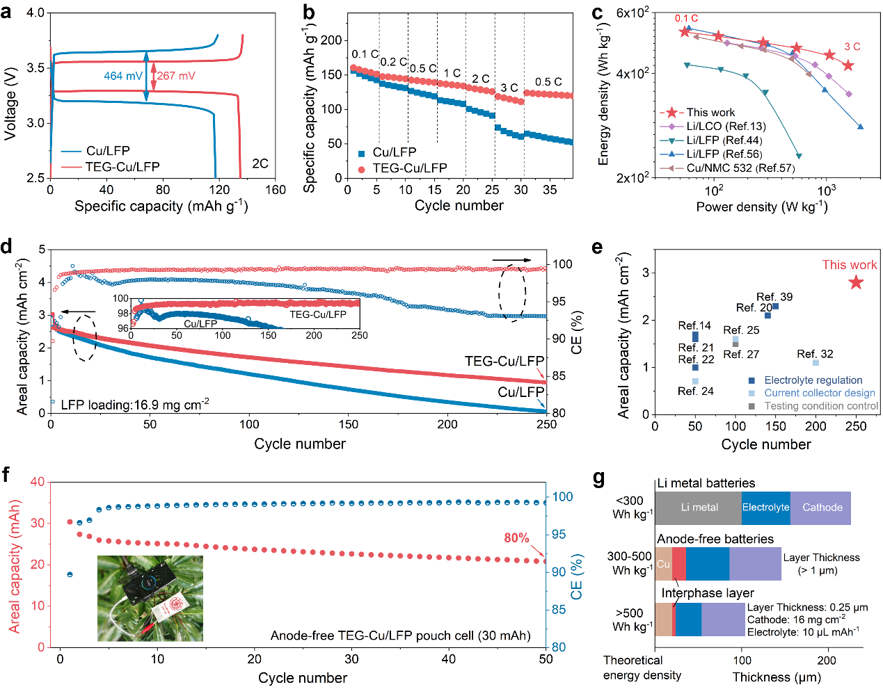 基于TEG界面层的无负极磷酸铁锂全电池显示出了较低的过电位、更高的倍率性能和循环稳定性。与以往工作相比,电池在功率密度、能量密度以及循环寿命等方面表现出显著优势(图5a-e)。此外,基于此制备的容量为30 mAh的无负极软包电池在循环50次后实现了80%的容量保持率,同时可为手机充电,进一步展示了其实际应用潜力(图5f)。值得注意的是,该超薄、超轻界面层的引入显著降低了电池的整体厚度和质量,进而有望进一步提升锂金属电池能量密度 (500 Wh kg-1)。