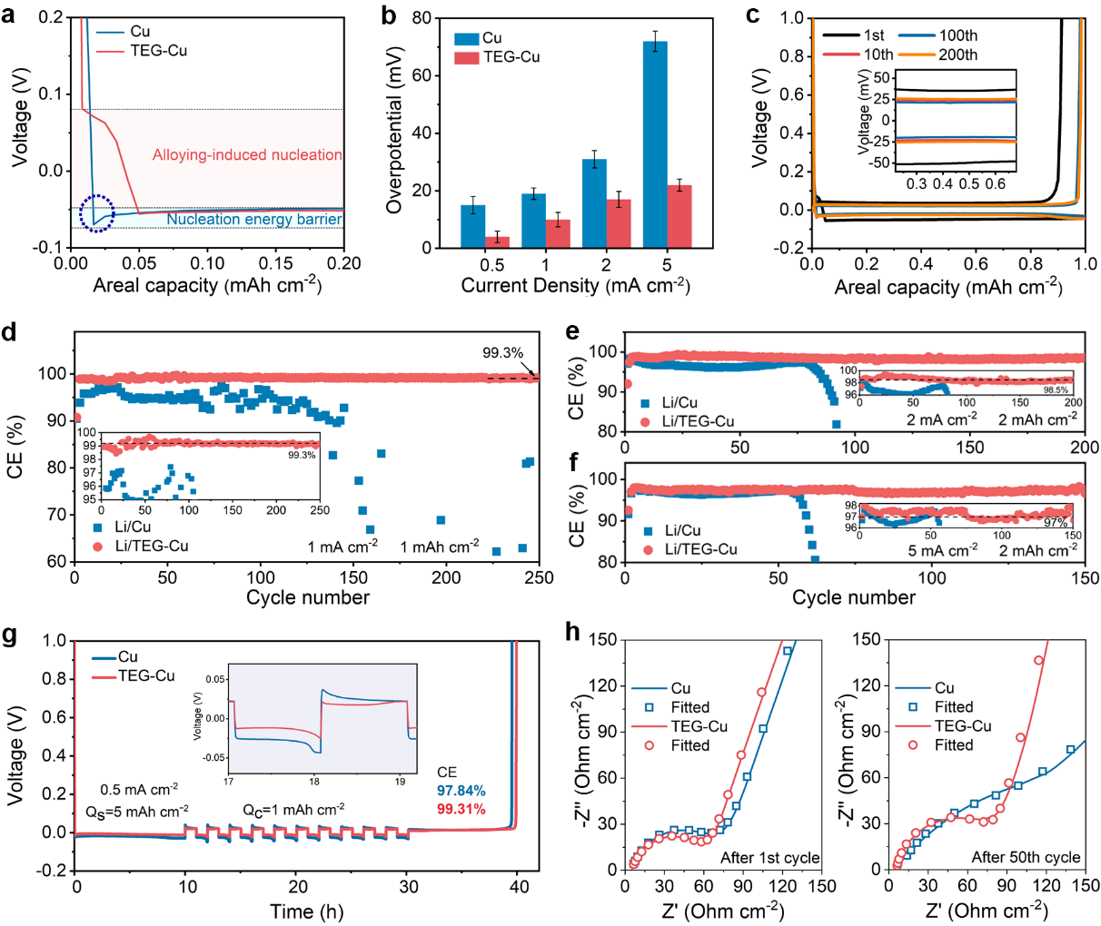 图2. 锂-铜半电池的电化学性能和电化学表征