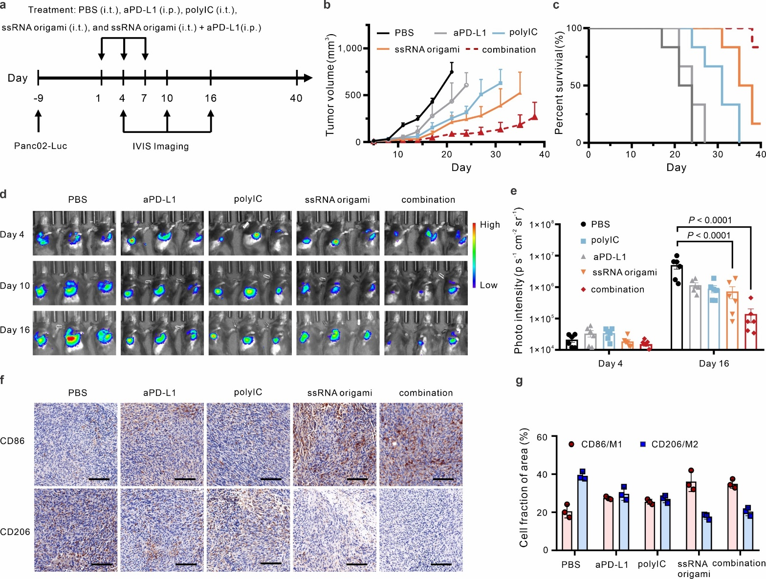 在分子和细胞实验的基础上,研究人员选取长边长的单链RNA作为新型佐剂,进一步在小鼠活体上,验证单链RNA折纸作为新型免疫佐剂的潜力。研究人员通过瘤内注射的方式,将209 bp的长方形单链RNA折纸注射到荷瘤小鼠体内,并使用单细胞测序(scRNA-seq)技术,分析比较实体瘤内免疫微环境中,先天免疫细胞的变化。研究人员发现,注射过单链RNA折纸的小鼠肿瘤中,相较空白组和polyIC实验组,有着更多激活的巨噬细胞和中心粒细胞,这些细胞展现出抗肿瘤的功能。最后,作者将单链RNA折纸联合PD-L1抗体,在小鼠胰腺癌皮下瘤模型上进行验证,发现单链RNA折纸可以联合PD-L1抗体,有效地实现肿瘤生长抑制。
