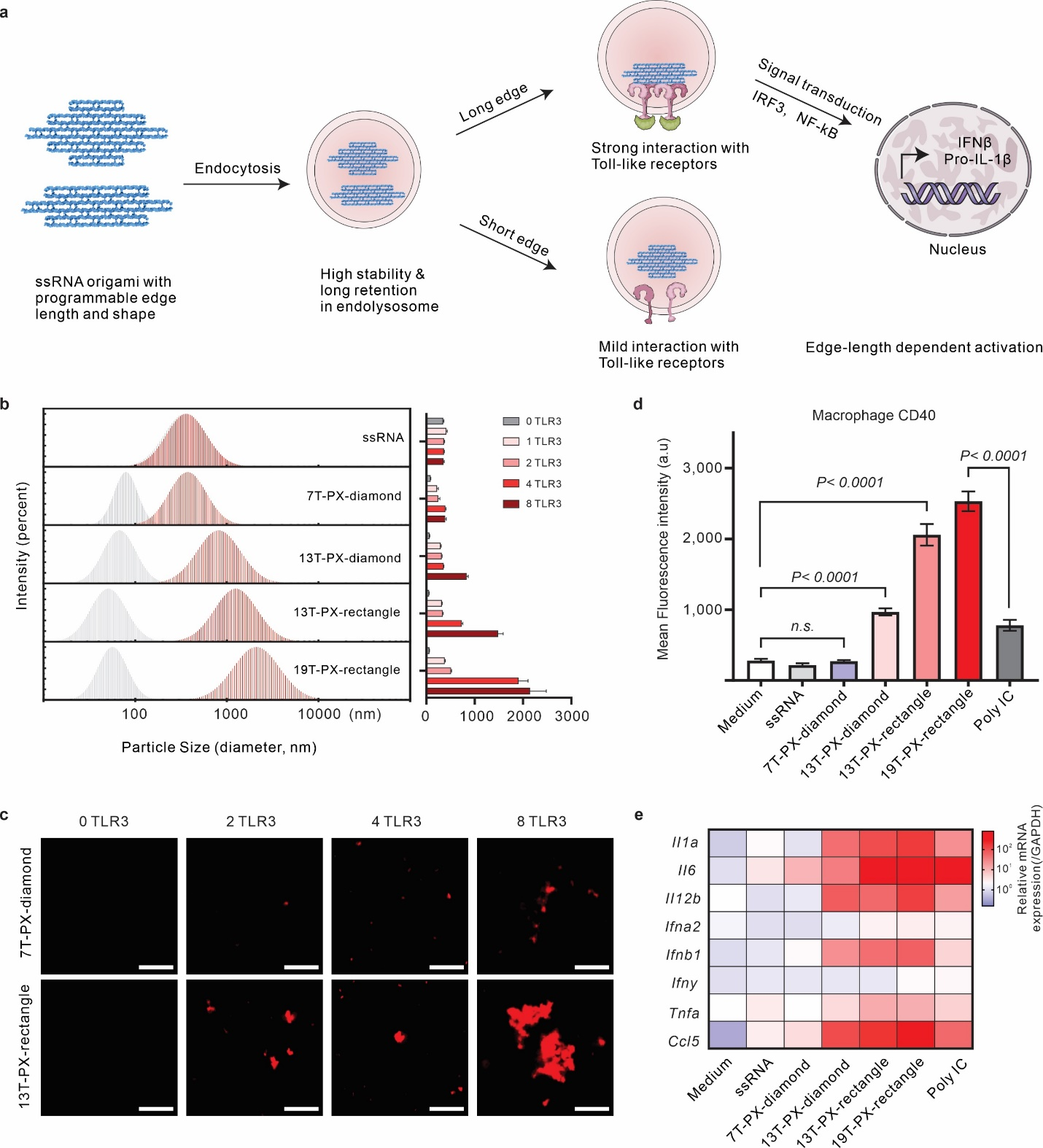 研究人员设计了不同形状和不同边长的单链RNA折纸。单链RNA折纸内部的P型交叉(paranemic-crossover)结构,大大提升了其抗RNA酶降解的能力,并提升了RNA折纸在内体溶酶体中的滞留时间,这也为后续TLR3的持续激活提供了基础。