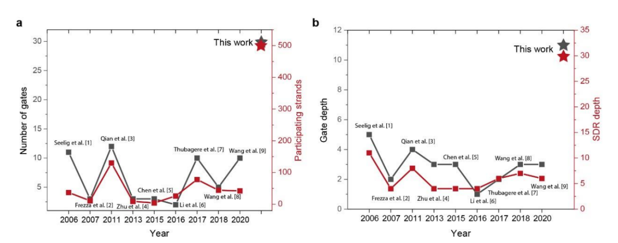 利用DPGA的可编程性与高集成度,本研究突破了DNA分子计算在电路规模和电路深度的瓶颈,首次在实验上展示了高达30个逻辑元件、500条DNA链,包含30层DNA链取代反应的电路规模。这也代表了近20年来DNA计算领域的新突破(图2)。