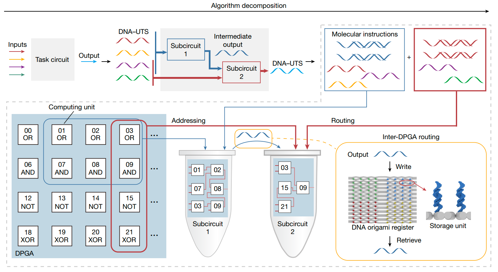 针对这一挑战性问题,研究团队首先证明了利用单链DNA作为统一传输信号(DNA-UTS),可实现类似电子在电路中传输的功能。进而,开发了一种支持通用性数字计算的DPGA,并支持器件层次的多DPGA集成,实现了器件内的可编程性和器件间可集成性。如(图1),当电路的复杂度超出单个DPGA可执行规模时,DPGA可分解为多个子任务,并生成对应的分子指令;每一个子电路的分子指令通过逻辑地址调用并连接参与运算的DNA元件,实现DPGA的编程;子电路之间的信号传输则通过DNA折纸寄存器介导的多DPGA布线实现,从而实现器件级的多DPGA集成。