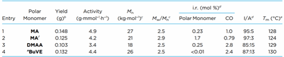 乙烯与极性单体的共聚是合成极性聚乙烯的有效手段,作者最后引入极性单体,利用该串联反应策略,进行乙烯,CO2和极性单体的三元共聚(表3)。当使用丙烯酸甲酯(MA)和N,N-二甲基丙烯酰胺(DMAA)时,成功得到了极性功能化的可降解聚乙烯。而正丁基乙烯基醚(nBuVE)由于在配位聚合中低的反应活性未能插入聚合物主链中。
