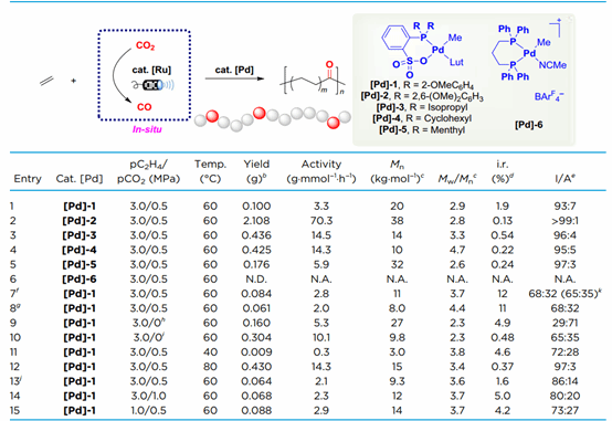 首先,作者以[Ru(Bpy)3]Cl2作光催化剂,BIH作电子供体,使用乙烯与CO2的混合气体,对CO2的光还原反应进行了研究(表1)。通过对反应体系的CO2分压,反应温度和光照强度的调控,以及添加助催化剂RuCl2(CO)2(Bpy)和[Ru(CO)2(Bpy)2](PF6)2,实现了对CO2还原速率的调控,为利用串联催化策略合成主链具有低含量羰基的聚乙烯奠定了良好的基础。