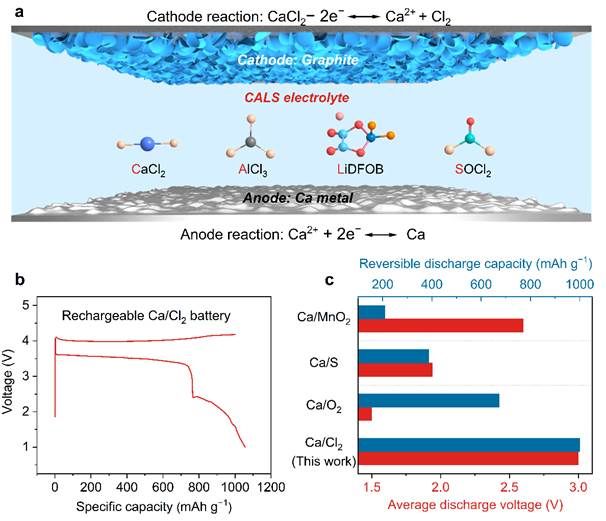 研究团队开发的可充电Ca/Cl2电池基于石墨正极和钙金属负极,以及CaCl2、AlCl3和LiDFOB盐溶解于SOCl2中组成氯基电解液(简称为CALS电解液)(图1a)。该电池提供了1000 mAh g−1的高可逆比容量和超过3 V的高放电电压(图1b),与目前钙金属电池中性能优异的正极材料(例如金属氧化物、硫和氧)相比具有较强的竞争力(图1c)。
