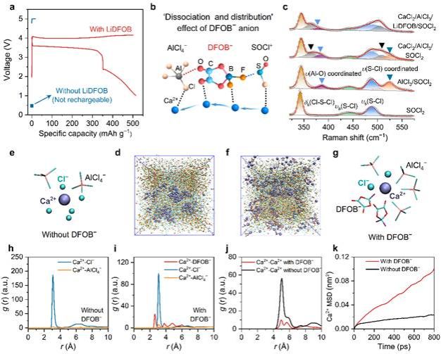 该团队基于LiDFOB的双配位作用提出了"解离-分布"效应,用以阐明LiDFOB在Ca/Cl2电池中的关键作用。例如,使用不含LiDFOB的电解液制备的电池无法提供任何充放电容量,也没有观察到明显的电压平台,这与LiDFOB存在下观察到的明显充放电行为形成了鲜明对比(图2a)。图2b展示了DFOB−的两个B−F和两个C=O官能团,能够有效地调控含氯物质(例如AlCl3和SOCl2)和Ca2+的解离和分布,从而促进它们的迁移并改善氧化还原反应的动力学。拉曼光谱证明了在DFOB−调控下,AlCl3和SOCl2之间能够充分解离(图2c)。分子动力学模拟了由DFOB−调控的Ca2+的溶剂化结构(图2d-g),并通过Ca K边X射线吸收光谱(XAS)进一步得到证实。在没有DFOB−的情况下,Ca2+离子的溶剂化壳层仅由氯基物种,如Cl−和AlCl4−组成(图2d, e)。相比之下,引入DFOB−导致形成了新的Ca2+–DFOB−离子对,显著改善了Ca2+的分布,如分子动力学模拟快照中观察到的(图2f, g),这归因于C=O…Ca2+和B−F…Ca2+配位(图2g)。径向分布函数(RDFs)进一步证实了DFOB−在溶剂化结构中的作用。Ca2+–DFOB−离子对距离(2.63 Å)小于Ca2+–Cl−(3.62 Å)(图2h, i),表明DFOB−与Ca2+的相互作用较强,能够与Ca2+和氯基物质之间的相互作用相竞争,从而改善它们的分布(图2j)。均方根位移(MSD)计算显示,在引入DFOB−后,Ca2+的迁移率提高了5倍(1.21× 10−6vs. 0.24 × 10−6cm2s−1)(图2k),这些证据表明,DFOB−的引入可有效促进AlCl3与SOCl2之间强相互作用的解离,从而实现CaCl2/Cl2的可逆快速氧化还原反应。