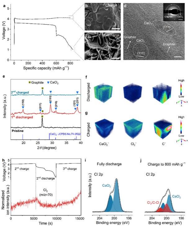研究团队借助扫描电镜,高分辨率透射电子显微镜和选区电子衍射,显示了CaCl2在石墨表面的生成和消耗(图3a-d)。X射线衍射进一步证明了放电和充电状态下CaCl2在石墨正极的生成和消失(图3e)。飞行时间二次离子质谱则展示了完全放电和充电状态下CaCl2和Cl2在石墨上的三维分布(图3f、g)。原位差分电化学质谱检测了电池充放电过程中Cl2的生成和消耗(图3h)。X射线光电子能谱进一步证实了在完全充电的正极形成了Cl2/C-Cl键(图3i,j)。上述针对正极产物的系统表征证实了CaCl2/Cl2氧化还原反应的可逆性。