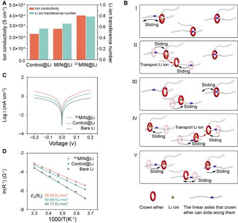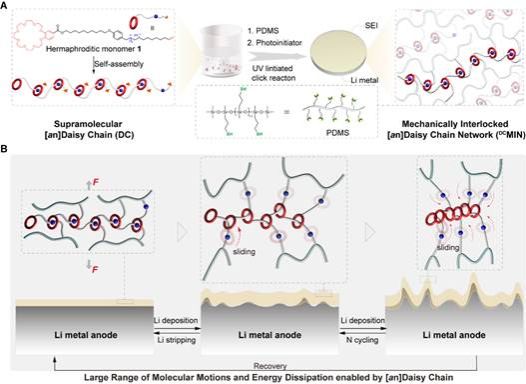 在此,欧宝app官方网站下载变革性分子前沿科学中心梁正课题组和颜徐州课题组合作在ASEI中引入了一个机械互锁的雏菊链网络(DCMIN),通过结合能量耗散和快速锂离子输运的功能来稳定锂金属界面。通过高效的硫醇-烯点击化学进行交联获得的DCMIN具有大范围分子运动特征,即DCMIN具有高灵活性和强力学性。此外,DCMIN中的冠醚单元不仅与柔性链上的二烷基铵相互作用,形成能量耗散行为;而且还与锂离子配位,支持DCMIN中锂离子的快速输运。因此,基于DCMIN ASEI的对称电池实现了2800小时的稳定循环(在1 mA cm−2,1 mAh cm−2的条件下),匹配高载量LiFePO4正极的全电池实现了优异的5C倍率性能。此外,与对照组相比,具有DCMIN ASEI的1-Ah锂金属软包电池(匹配高载量LiNi0.88Co0.09Mn0.03O2正极)表现出更好的容量保持率(88%)。总之,该工作提出的DCMIN分子设计为高能量LMA ASEI的优化提供了新的见解。