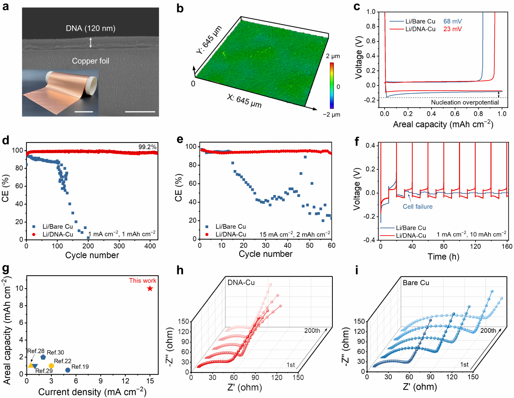 图3. DNA界面层及锂-铜半电池的电化学性能