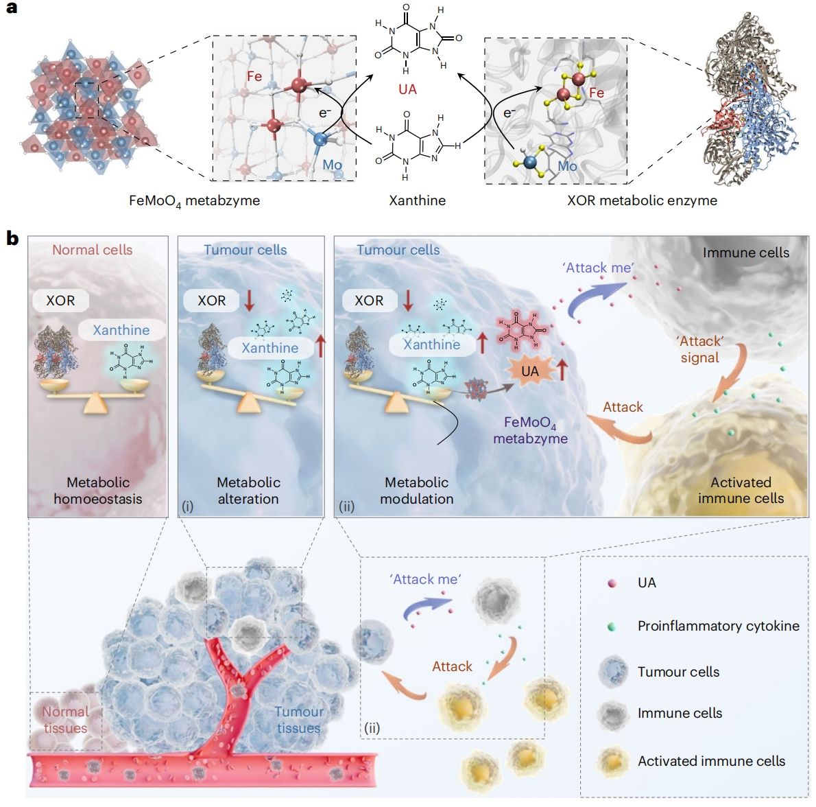 近日,欧宝app官方网站下载变革性分子前沿科学中心凌代舜教授团队和欧宝app官方网站下载医学院李方园教授团队合作,在《Nature Nanotechnology》发表题为“An artificial metabzyme for tumour-cell-specific metabolic therapy”的研究论文。该研究首次聚焦肿瘤广谱代谢标志物作为代谢免疫检查点,提出全新的肿瘤代谢激活免疫治疗策略;团队创新合成了一种模拟黄嘌呤氧化酶(xanthine oxidoreductase,XOR)中铁和四面体钼原子构象的的FeMoO4生命体系催化剂,称为“人工代谢酶”。该人工代谢酶能够催化肿瘤细胞内黄嘌呤转化为尿酸;尿酸分子作为新的“定位和激活信号”,实现激活免疫系统的功能,诱导其附近的巨噬细胞向M1表型极化,使其特异性识别并吞噬肿瘤细胞,从而精准地实现肿瘤特异性的代谢激活免疫治疗(图1)。有趣的是,这种代谢调节促进了肿瘤细胞间代谢与免疫系统的相互作用,从而引发免疫细胞对肿瘤细胞的协同攻击——这是一种化学生物学驱动肿瘤细胞特异性代谢激活免疫治疗的范式创新。该人工代谢酶展示了在生命体系代谢画布上靶向改造肿瘤细胞的潜力,将肿瘤细胞自己定位为一个燃烧的“火花”来刺激免疫系统的定点激活。