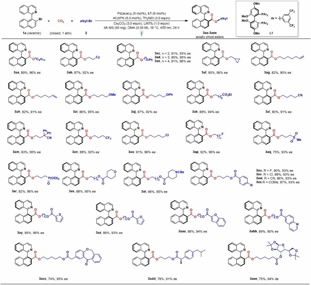 作者以1-(2-溴萘-1-基)异喹啉1a和1-溴正己烷2a作为模板底物,以4CzIPN为光催化剂,Pd(acac)2作为钯催化剂前体,(R)-BTFM-Garphos (L1) 为手性配体,DIPEA作为还原剂,碳酸铯作碱,双三氟甲磺酰亚胺锂和4Å分子筛作为反应添加剂,N, N-二甲基乙酰胺作溶剂,在一个大气压CO2氛围以及455 nm蓝光照射下,16 ℃反应24小时,即可以89%的分离产率以及96%的ee值得到产物3aa。在最优反应条件下,作者首先对烷基溴底物适用范围进行了考察,多种烷基溴化物上的各种官能团如氟、氯、甲氧基、三氟甲基、膦酸酯基以及一些药物分子片段均具有良好的兼容性(图2)。