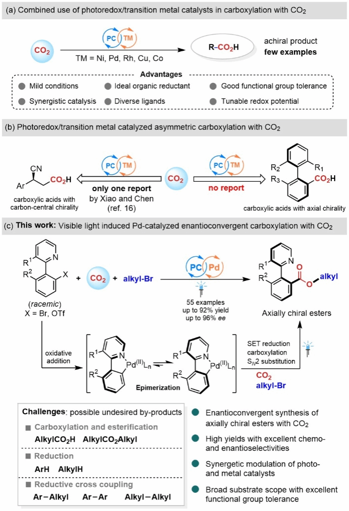 二氧化碳(CO2)作为一种储量丰富、无毒且可持续的碳资源,其高效转化合成多种高附加值化学品受到了化学家们的广泛关注。过去几十年,研究者们已经发展出一系列方法将CO2转化为多种羧酸类化合物,但是由于CO2自身的热力学稳定性和动力学惰性,其转化通常需要较苛刻的条件;此外,CO2非极性的分子结构使得其与金属的配位能力较弱。因此以CO2为原料,通过金属催化不对称碳-碳键形成来合成手性羧酸一直是该领域的挑战性难题。尽管近年来也有一些CO2不对称催化转化的报道,但大多数都集中在中心手性的构建,而利用CO2的不对称羧化反应构建轴手性羰基化合物的研究还很少。近十年来,光氧化还原与过渡金属协同催化体系受到越来越多的关注,与单一催化体系相比,该协同催化体系将光催化和过渡金属催化的优势相结合,不仅打破了传统金属催化的反应模式,而且光催化体系的引入使得催化金属的价态更加丰富可调,从而带来新的反应性能。除此之外,光催化和金属催化这两个独立的催化循环能够实现更加精细的反应性和选择性调控。