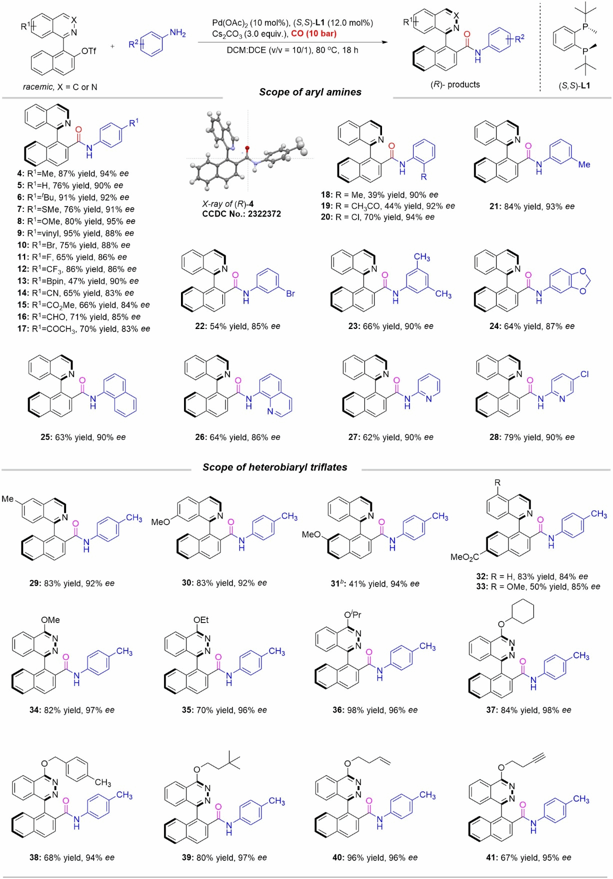 作者以消旋的联杂芳基三氟甲磺酸酯化合物1a和对甲基苯胺2a作为模板底物,以Pd(OAc)2作为催化剂,(S, S)-BenzP (L1) 为手性配体,碳酸铯作碱,二氯甲和1,2-二氯乙烷作为反应溶剂,在10 个大气压CO氛围下80 ℃反应18小时,即可以87%的分离产率以及94% 的ee值得到轴手性酰胺产物。