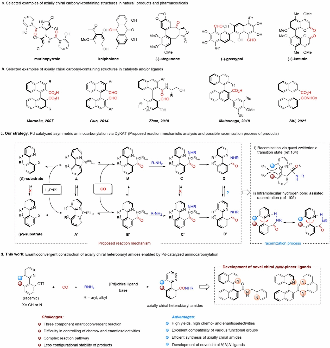 轴手性羰基化合物不仅广泛存在于天然产物、生物活性分子、药物和材料中,也是一类具有优势结构的手性配体或有机催化剂,在不对称催化中具有广阔的应用前景。但是这类结构的合成往往需要繁琐的步骤,一定程度上限制了它们的进一步发展。尽管近年来不对称催化合成轴手性化合物的方法得到了空前发展,但通过不对称羰基化反应直接合成轴手性羰基化合物仍有待发展。