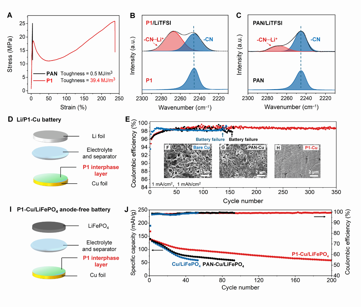 研究人员还将合成的聚合物应用在无负极锂电池界面层中。研究结果表明,相比于聚丙烯腈,GTRP策略合成的聚合物,可以通过聚合物中-CN基团的分布,影响分子链间相互作用和自由体积,进而极大地提升了聚合物的韧性,增强了-CN与锂离子的相互作用,实现了锂离子的均匀沉积和高效传输。材料表现出优异的力学性能以及与锂离子的强相互作用,可以实现无负极锂金属电池的高库伦效率和长循环稳定性,提高无负极锂金属电池的使用寿命。