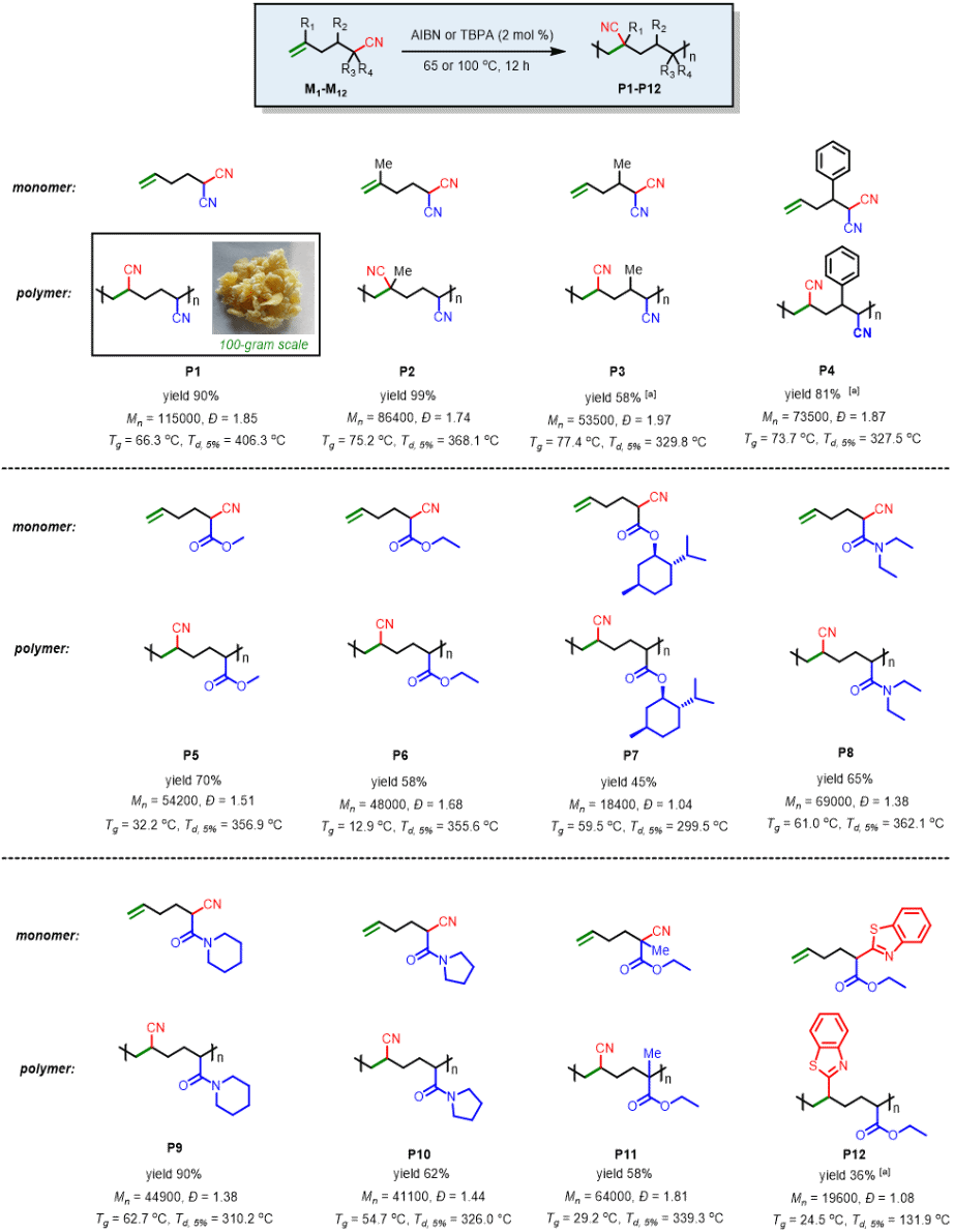 通过聚合条件优化,均聚反应只需在引发剂/65 ℃的条件下单体的转化率可高达96%,并且非石油化工原料来源的聚合单体,简单易得,成本较低。此外,该聚合反应已成功放大至100克的聚合规模,展示了其在实际生产中的潜力和应用前景(图 2)。利用对1H NMR, COSY, HSQC,HMBC以及MALDI-TOF MS等谱图的分析可以确定聚合物的结构,与此同时通过动力学研究发现该策略是典型的自由基聚合过程。研究人员进一步拓展了氰基迁移自由基聚合的底物种类,均可以以中等以上的分离产率得到相应的聚合物,从而证明了其广泛的底物适用性和反应的通用性,同时通过官能团种类的变化得到一系列具有独特结构的高分子材料。TGA结果表明聚合物具有较好的热稳定性(Td,5%> 300 ℃)。