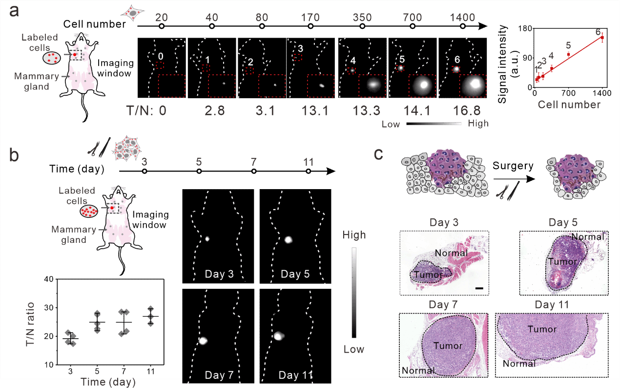 恶性肿瘤易产生侵袭性微转移,对早期诊断和手术治疗带来了巨大的挑战。目前的成像探针难以同时兼顾高灵敏度、深部组织穿透性和组织特异性。NIR-II的荧光成像显示出更好的组织穿透性、低背景自发荧光和最小的光子散射,具有很高的信噪比,在体内成像和图像引导手术中显示出巨大的前景。然而,目前尚缺乏设计NIR-II探针的通用途径,可同时满足超高灵敏度、深组织穿透性和组织特异性的要求。
