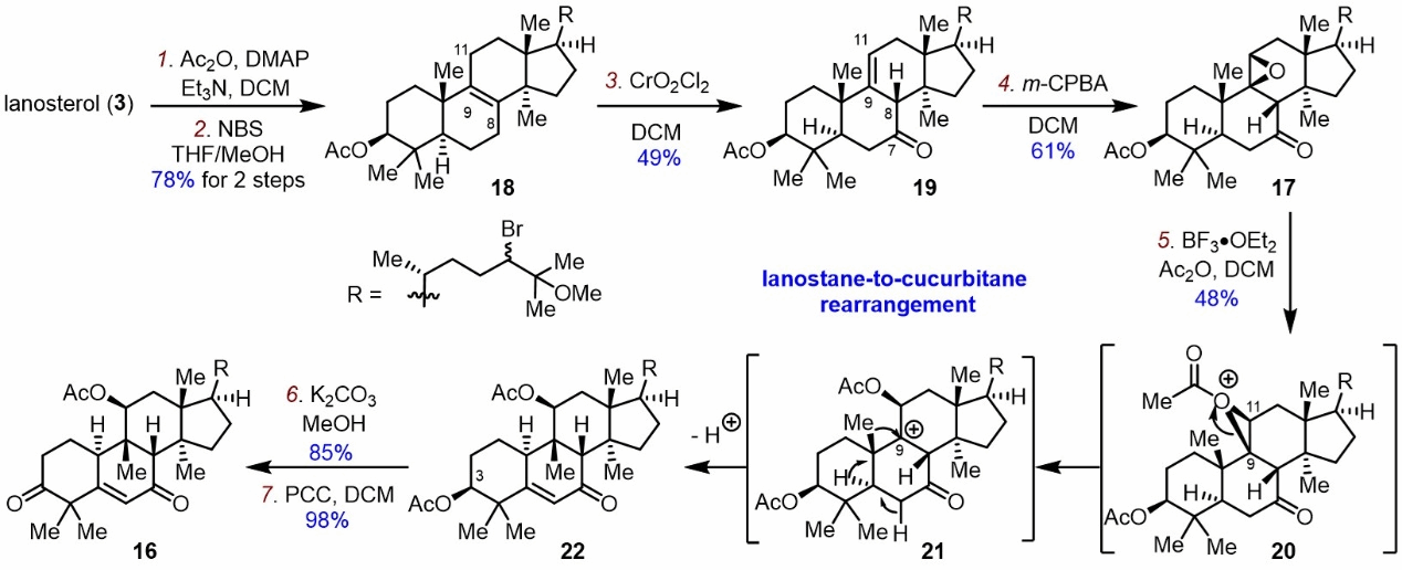 于是,作者从羊毛甾醇出发,来进行合成。首先C3位羟基乙酰基保护,然后侧链溴甲醚化保护,得到18。 随后依次经铬酰氯氧化、环氧化得到化合物17,然后经过仿生的Wagner-Meerwein重排构建C9位甲基,成功实现从羊毛甾烷到葫芦烷骨架的转化得到化合物22,后者经过选择性脱C3位乙酰基、PCC氧化,得到了A/B并环的6/6环葫芦烷三萜化合物16(如图5)。