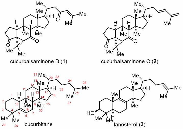 葫芦烷是一类广泛分布于葫芦科及其他植物中的次生代谢物,它们作为异源化学信息素,可以保护植物免受外部生物侵袭。如图1所示,从结构上看,葫芦烷类属于四环三萜类家族。这些高氧化态的葫芦烷类化合物通常具有多样的生物活性,包括抗肿瘤、抗炎和抗HIV病毒等。其中,cucurbalsaminones B (1) and C (2)是法国化学家Ferreira课题组于2019年从Momordica balsamina的甲醇提取物中分离得到的两个新型abeo-葫芦烷三萜类天然产物。与普通葫芦烷相比,cucurbalsaminones具有独特的5/6/3/6/5五环骨架,初步的生物活性研究表明它们具有较好的多药耐药(MDR)逆转活性。其在自然界中较低的含量(1的含量约为0.00024 wt %,2的含量约为0.00067 wt % ),独特的骨架结构,以及有趣的生物活性吸引了作者的合成兴趣。近日,欧宝app官方网站下载吴晶晶副教授课题组成功实现了cucurbalsaminones B and C的仿生合成,相关成果发表在Angew. Chem. Int. Ed.上。
