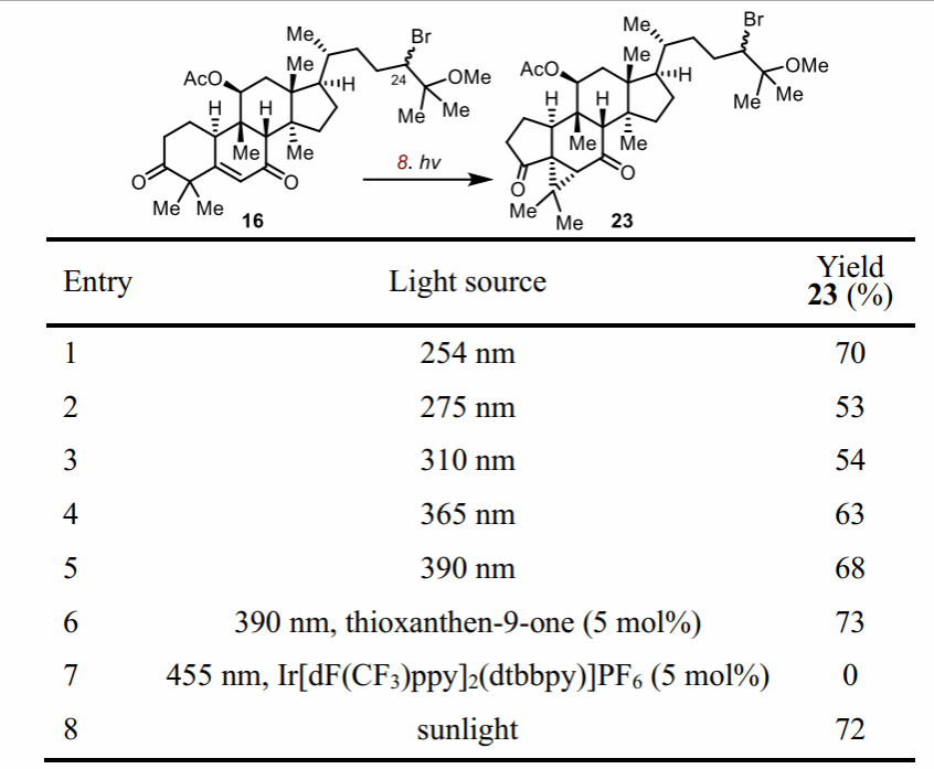 之后作者尝试光化学oxa-di-π-methane(ODPM)重排构建天然产物的5/6/3三环体系。如表1所示,作者首先尝试在紫外光254nm条件下进行实验,可以以较好的收率得到单一的非对映异构体化合物23,之后作者发现在275、310和365nm波长下均可以以中等收率得到想要的目标产物,让人欣喜的是,该反应在390nm条件下也能很好进行。然而在455nm的可见光条件下,即使是使用了光催化剂Ir[(dFCF3ppy)2dttbpy]PF6,反应依然不能进行。考虑到太阳光中亦包含7%左右的紫外光,令人惊喜的是,作者将反应置于室外,在太阳光照射条件下也可以以较好的收率得到目标产物。基于以上实验结果,作者推测光化学oxa-di-π-methane(ODPM)重排更可能为该类天然产物的生源合成途径。