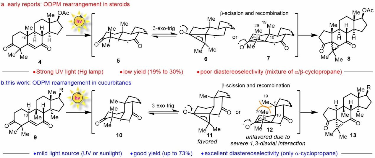 由于羊毛甾醇(3)是一类具有类似的四环三萜骨架且廉价易得的资源型化合物,作者拟将其作为起始材料,来进行合成。葫芦烷与羊毛甾烷的主要区别在于甲基在C9位而不是在C10位,生源合成上认为,葫芦烷是由羊毛甾烷重排而来,因此,作者也拟将这种仿生重排应用到合成中。此外,另一个挑战是如何将普通葫芦烷三萜的6/6并环的A/B环骨架,转化为天然产物所需的5/6/3三环骨架。分离问题提出的生源合成假说认为,酸催化的Michael加成型1,2-烷基迁移,得到烯醇负离子-碳正离子型 Zwitterion型中间体,再通过分子内烷基化形成环丙烷环。作者根据此生源合成假说进行尝试,均没有得到想要的目标产物。基于作者课题组在光化学领域的研究兴趣,作者设想了一种光化学oxa-di-π-methane(ODPM)的重排方法来构建天然产物的5/6/3三环体系。值得注意的是,在类似的甾体化合物中,已经有关于ODPM重排的报道(如图2a),但它们具有明显的局限性。该反应利用高压汞灯,这可能降低了官能团的耐受性,因此导致反应收率均低于30%。此外,根据Schaffner的结果,得到了α/β-两种环丙烷的混合物,这意味着这种ODPM重排可能具有较差的非对映选择性。作者认为,这些例子中较差的非对映选择性可能是其底物构象的原因。由于葫芦烷化合物在立体化学上与甾体非常不同,经过构象分析(如图2b),作者认为在葫芦烷中,获得β-环丙烷所经历的中间体12,其C4位甲基与C9位叔碳具有较大的1,3-二直立键相互作用,难以生成,因此在葫芦烷底物中可能具有更好的非对映选择性。因此环丙烷的高非对映选择性可归因于反应过渡态的空间位阻效应。与之前甾体体系中的研究相比,本文研究的葫芦烷体系,在产率和选择性方面取得了显著突破。