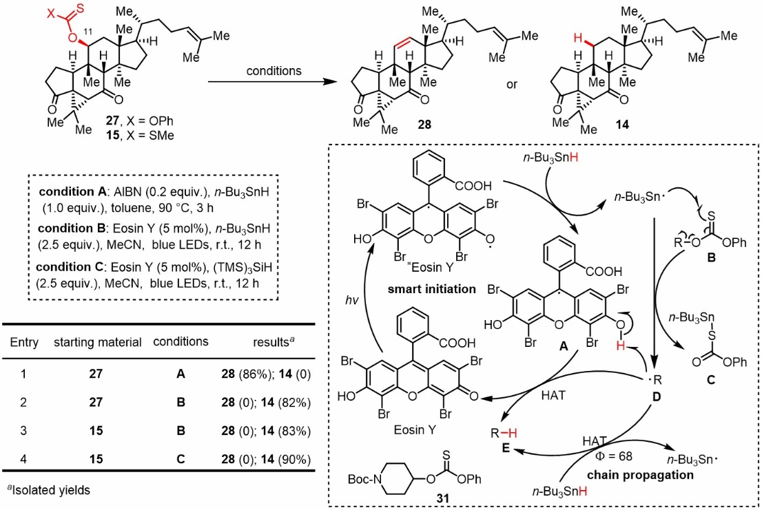 之后,作者尝试巴顿脱氧反应,在经典的巴顿脱氧条件下均得到消除产物(如图5所示)。基于在光化学领域的研究兴趣,作者发展了一种Eosin Y光催化的Barton-McCombie脱氧反应,成功实现了大位阻、高度拥挤的C11位羟基的脱除反应,有效避免了常规加热条件下的Chugaev消除副反应。作者通过量子产率测定实验,进一步证实了该反应经历了自由基链式历程。