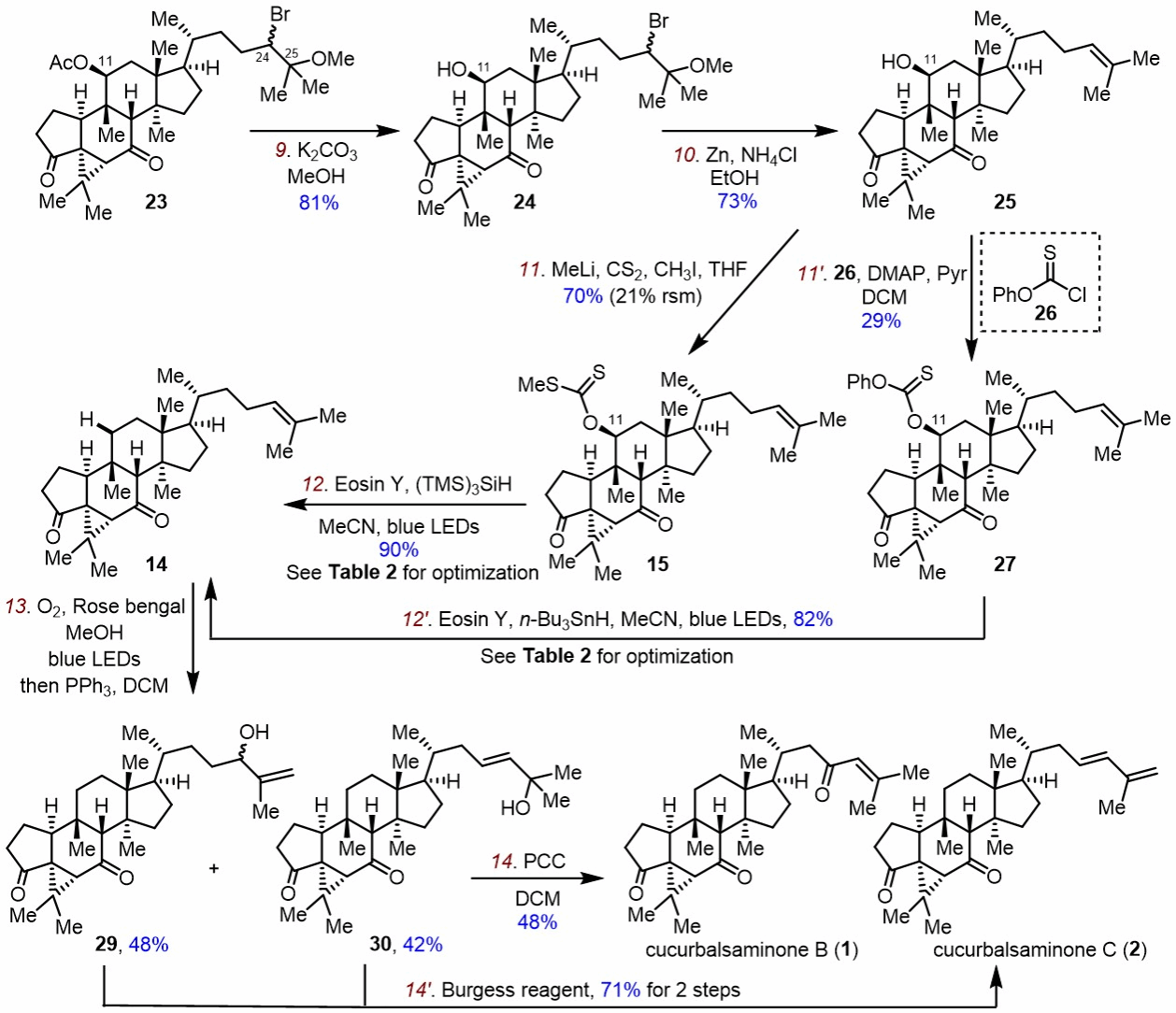 得到化合物23之后,作者尝试调整C11位的氧化态,首先脱掉C11位乙酰基,锌粉还原得到C24,25双键化合物25,由于C11位位阻大,作者经过一系列尝试,最终在MeLi条件下与CS2,MeI反应,能以较好的收率得到巴顿酯化合物15。