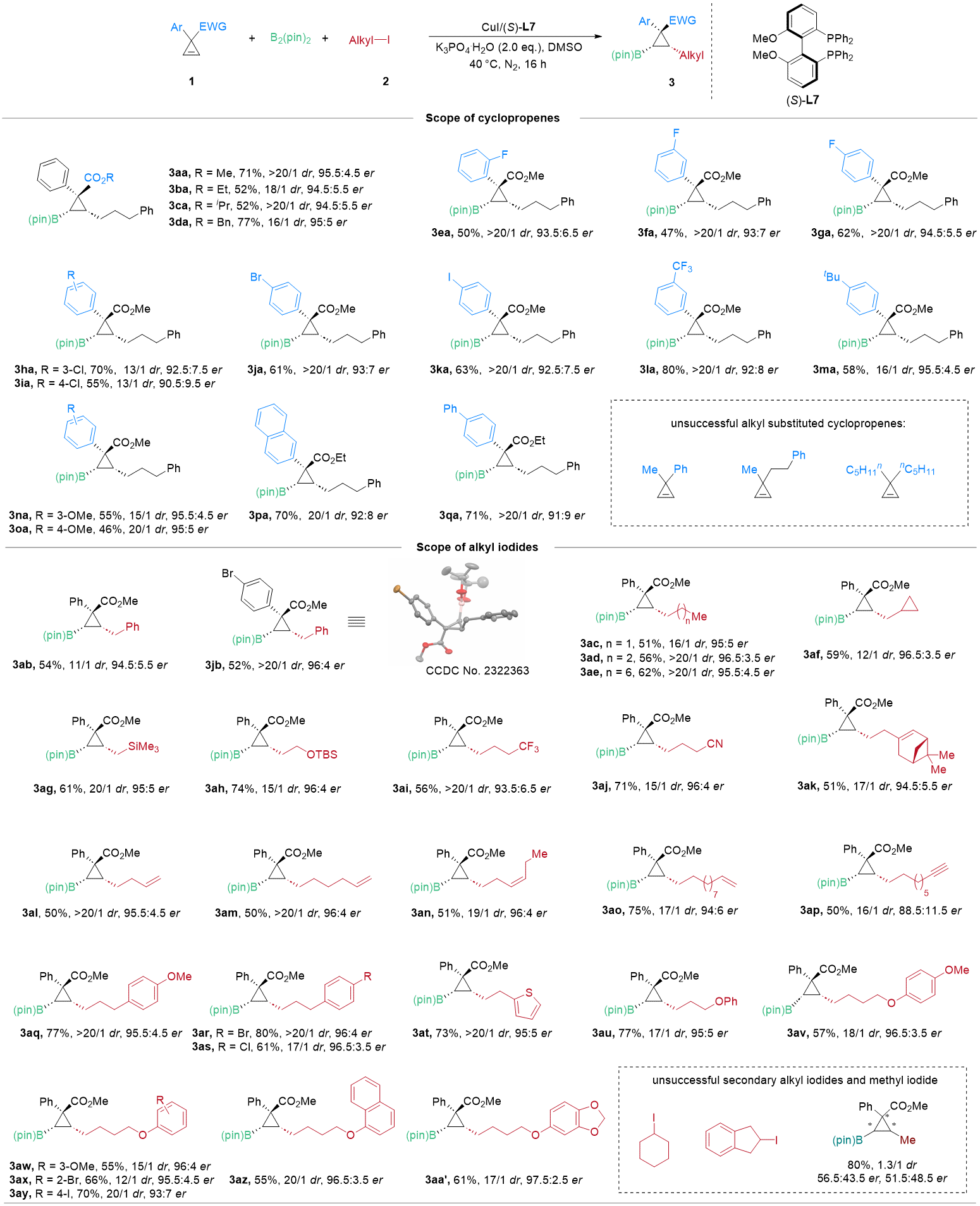 作者以甲基1-苯基环丙烯-2-羧酸酯(1a)和3-碘丙基苯(2a)为模型底物,以双(频哪醇)二硼(B₂pin₂)作为硼化试剂,以CuI作为催化剂前体,(S)-MeO-BIPHEP (L7) 为手性配体,一水合磷酸钾作为碱,DMSO作为反应溶剂,在氮气氛围下40 ℃反应16小时,即可以72%的分离产率,大于20:1的非对映选择性以及91%的ee值得到连续三手性中心环丙基硼酸酯3aa。