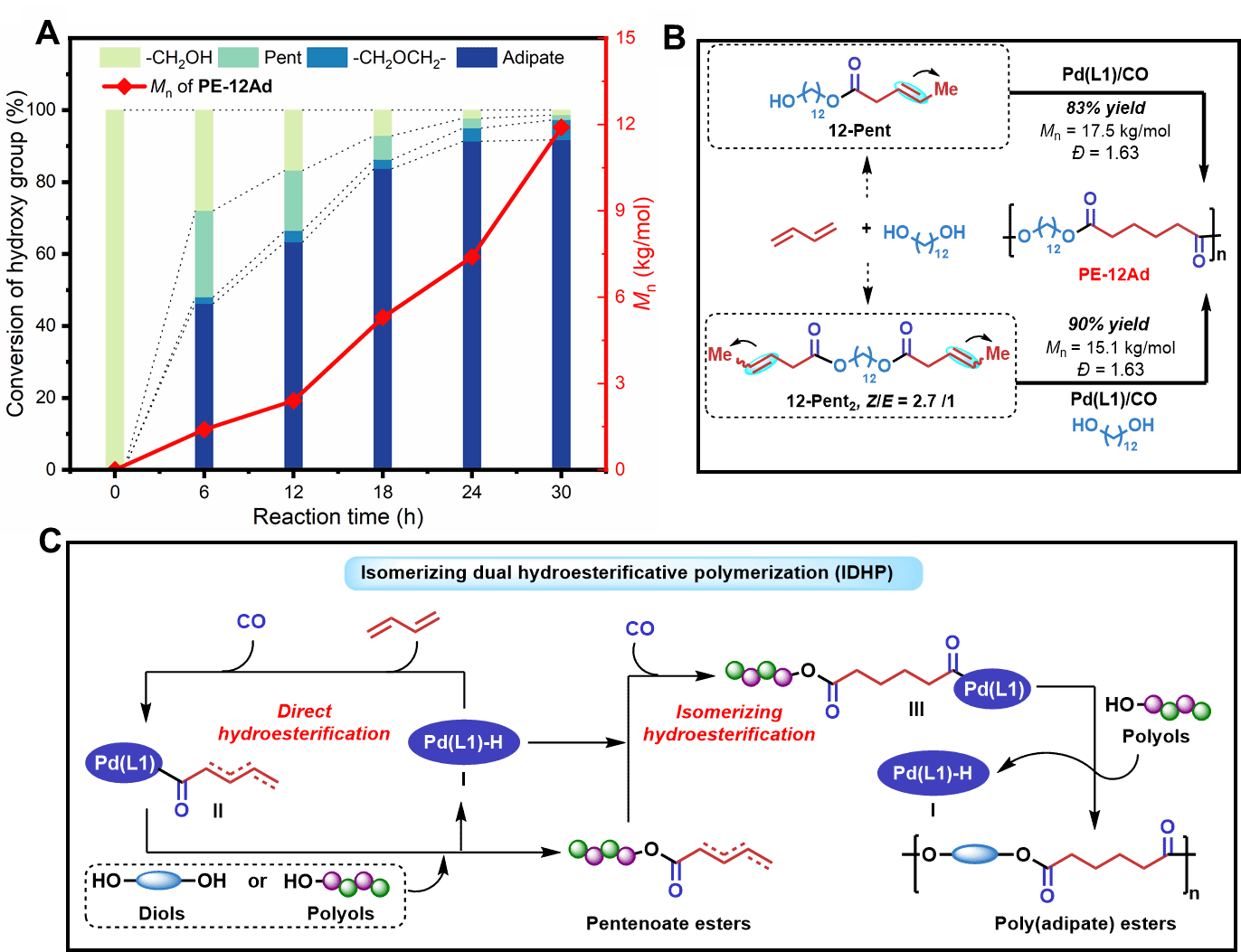 聚己二酸酯作为己二酸下游的重要产品之一,可用于制造可降解塑料PBAT和聚氨酯材料。当前聚己二酸酯的工业生产路线以苯为原料,需要经历氢化-氧化-再氧化-缩聚等多个合成步骤。该路线不仅工艺繁琐、能耗高,而且会释放大量的氮氧化物以及多种废弃物,带来严重的环境问题。尽管近年来已经发展了多种己二酸(酯)的绿色合成新方法,但是一直未能实现聚己二酸酯的直接合成。针对这一挑战,欧宝app官方网站下载变革性分子前沿科学中心的刘家旺团队和唐山团队合作,提出了“迁移双氢酯化聚合(IDHP)” 的新概念,以大宗工业原料1,3-丁二烯、一氧化碳以及生物质来源的多种二醇为起始原料,通过高效的催化羰基化聚合反应,一步直接合成聚己二酸酯。