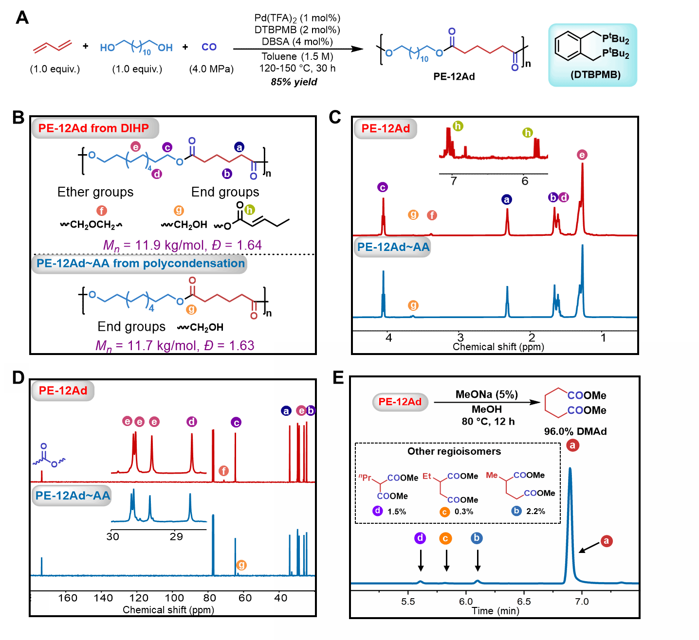 首先,研究团队选用钯和双膦配体催化体系,对聚合条件进行了研究,当使用双膦配体DTBPMB时,反应具有较好的结果。以1, 12-十二烷二醇为单体时,所得聚己二酸十二烷二醇酯产物的数均分子量达到11.9 kg/mol,其中己二酸酯单元的选择性(b/l)大于20/1。核磁表征发现,通过IDHP得到的聚酯,其分子主链与工业上缩聚得到的高分子几乎一致。同时,聚酯的各种热力学性能也与缩聚得到的聚合物相近。