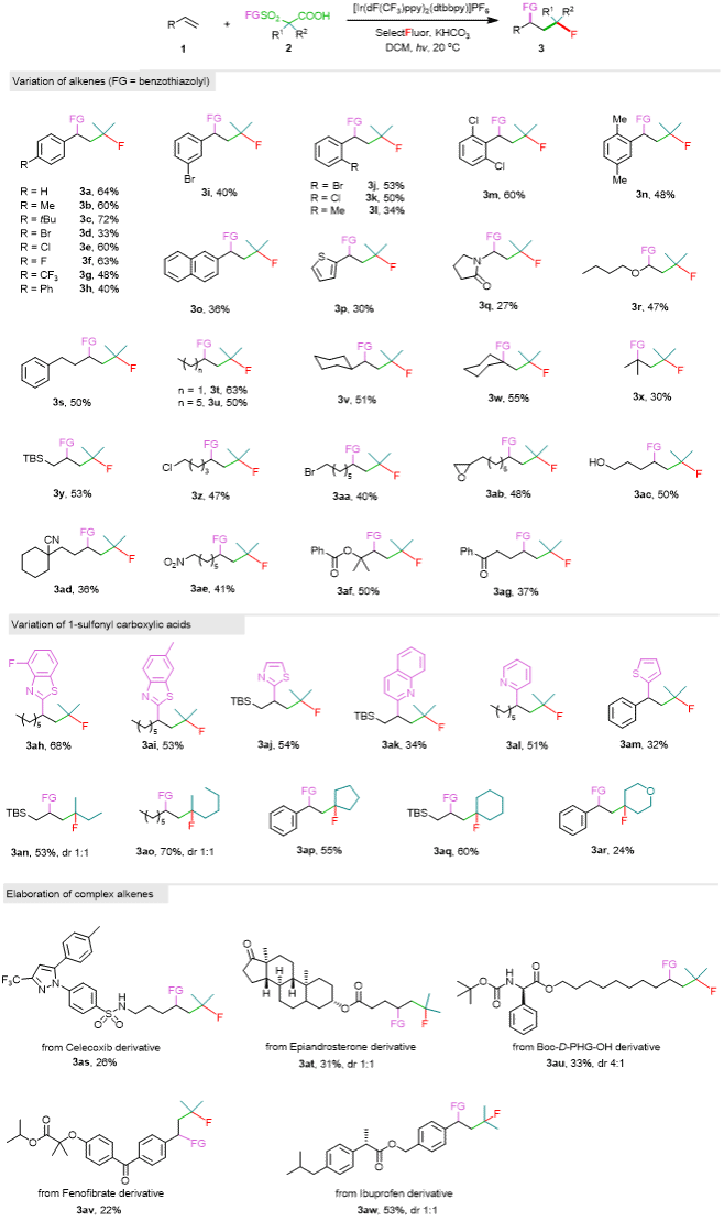 综上所述,本研究通过自由基介导的脱羧-脱砜双官能团化反应实现模块化合成含氟化合物。与传统自由基脱羧单氟化策略不同,该反应在光照条件下,通过多组分反应同步构建多重化学键,为合成具有显著结构复杂性和广泛多样性的含氟化合物提供了通用途径。该策略展现出广泛的底物适用性和优异的官能团兼容性,无论是苯乙烯衍生物还是更具挑战性的非活化烯烃,均可作为高效底物参与转化。此外,该方法能实现单氟烷基结构在复杂烯烃骨架中的精准引入,为含氟化合物的高效构建提供了一种新型合成方法。