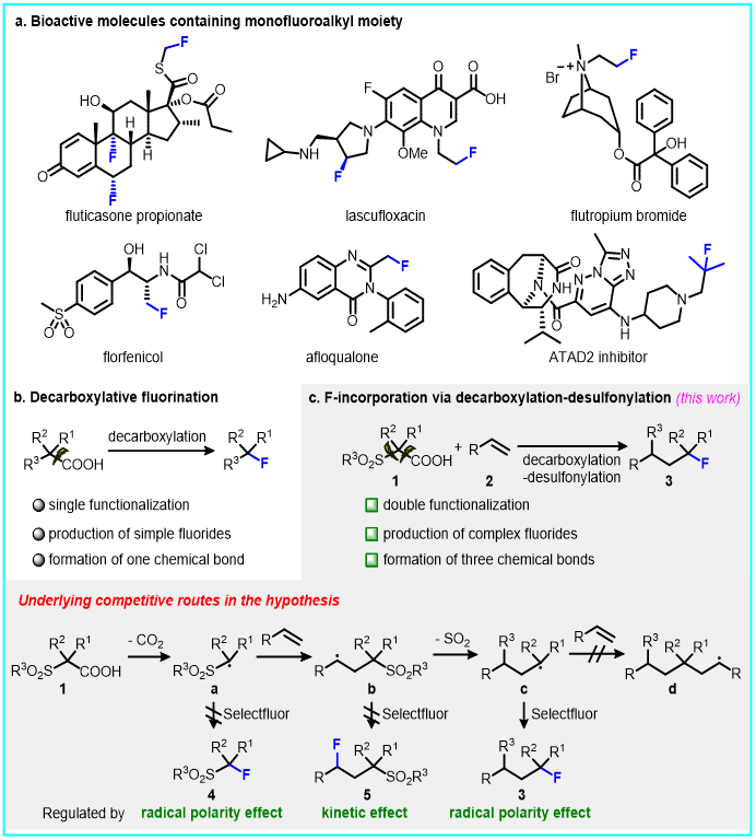 图 1. 含氟结构的重要性及其自由基引入策略。a) 含氟结构在生物活性分子中的重要作用;b) 传统脱羧氟化反应过程;c) 脱羧-脱砜化反应实现含氟化合物的构建