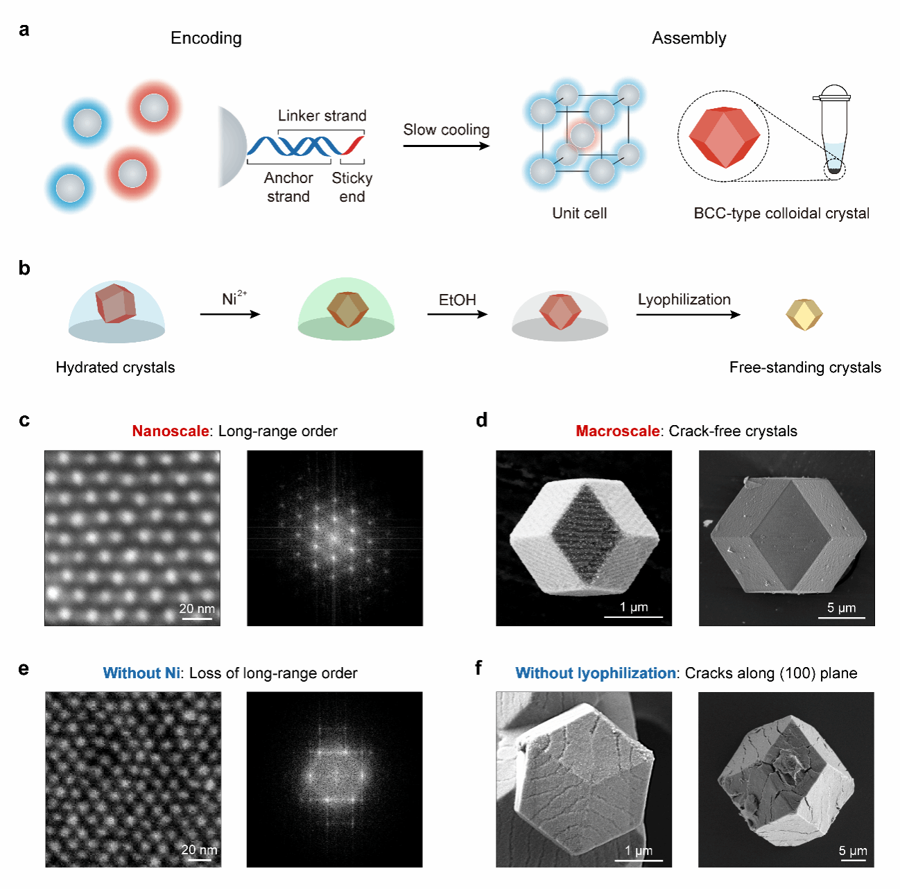 本研究发展了一种镍离子辅助冷冻干燥技术(NAD),通过Ni²⁺-DNA可逆配位与冷冻干燥的协同作用,突破刚性-适应性权衡难题,实现了DNA工程胶体晶体的快速(<2 h)、无损固态化。该技术保留了晶体从纳米到宏观尺度的多级有序性,并赋予其增强的等离子体反射特性,为光子电路、近场光学器件及量子等离子体学提供了材料基础。