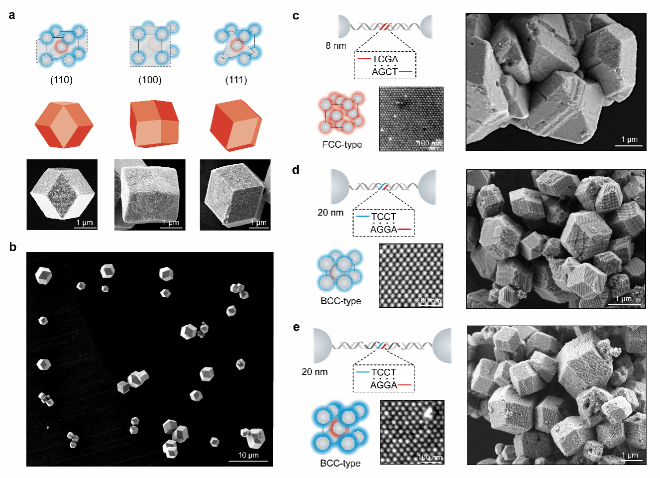 NAD策略适用于多种晶格构型:BCC晶体保留(110)、(100)、(111)晶面取向,且可实现大批量制备;FCC晶体维持(111)面六方排列;20 nm金颗粒构建的BCC晶体及DNA连接子扩展的晶体均保持结构完整性。值得注意的是,DNA层收缩率稳定在35–40%,证实方法普适性。高分辨成像揭示了多维缺陷:0D自间隙缺陷、TSK模型描述的台阶-扭结缺陷、BCC晶体的(112)面堆垛层错以及孪晶和晶界缺陷,为晶体生长机制研究提供新视角。