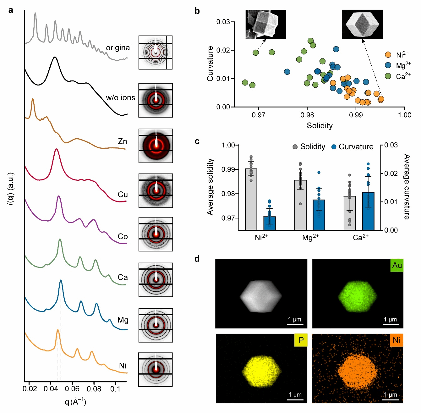 通过系统筛选六种二价金属离子(Zn²⁺、Cu²⁺、Co²⁺、Ca²⁺、Mg²⁺、Ni²⁺)发现,DNA结合亲和力(Zn²⁺>Cu²⁺>Co²⁺>Ni²⁺>Ca²⁺>Mg²⁺)与结构保存能力呈负相关。SAXS数据表明,Ni²⁺、Ca²⁺、Mg²⁺能维持清晰的衍射峰,其中Ni²⁺处理的晶体晶格收缩率约45%(30.05 nm→16.5 nm),但长程有序性最佳。形貌分析进一步证实,NAD晶体具有最高平均坚实度和最低边界曲率。SEM-EDS元素映射显示Ni均匀分布于晶体,印证其稳定锚定于DNA网络。