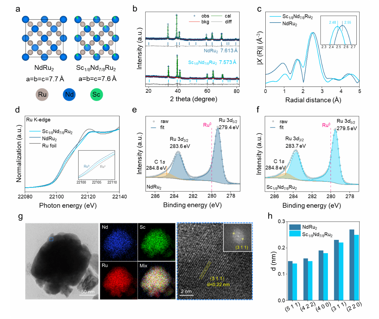 通过预实验,确定改性方法为Sc元素取代Nd,比例为1/8。为证明合成出Sc1/8Nd7/8Ru2,作者首先通过XRD(图3 b)确认不含杂相。理论计算(图3 a),Rietveld精修(图3 b),EXAFS(图3 c)和TEM(图3 g-h)均表明Sc1/8Nd7/8Ru2的晶胞参数小于NdRu2,该现象是由于Sc的半径更小导致的。同时,由于电负性关系为Ru>Sc>Nd,相对于NdRu2,Sc1/8Nd7/8Ru2中Ru得到的电子更少,这一变化通过XANES(图3 d)和XPS(图3 e-f)证实。