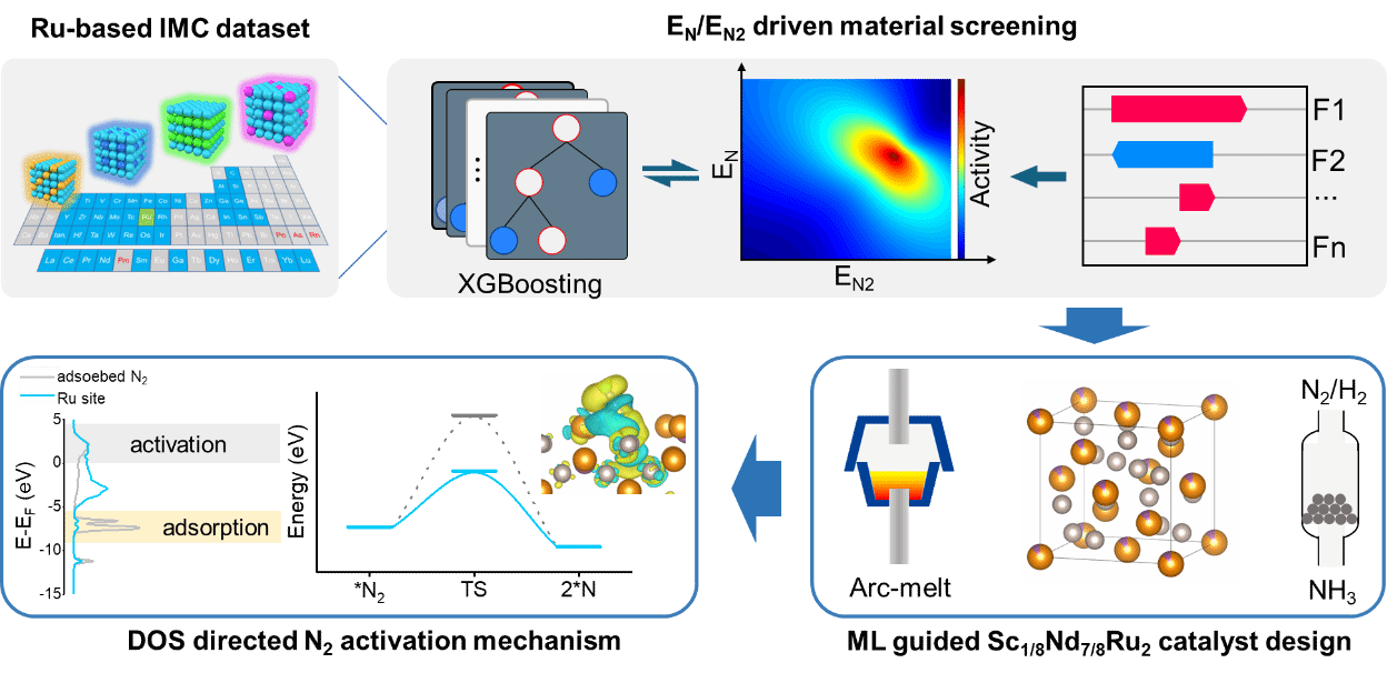 氨(NH3)作为重要的化肥原料和清洁能源载体,其工业生产目前主要依赖高温高压的Haber-Bosch工艺,该过程能耗约占全球总能耗的2%。这一工艺的核心挑战在于如何高效断裂N≡N三键,而开发高效催化剂以降低反应能垒是解决问题的关键。根据金属的氮亲和性与催化活性之间存在的火山型关系,钌(Ru)基催化剂展现出良好的应用前景。然而,目前仍缺乏系统的理论指导来推动高活性Ru基合成氨催化剂的定向设计。金属间化合物(IMCs)因其有序的晶体结构和可调控的组分优势,被视为一类极具发展潜力的新型合成氨催化剂。但面对数量庞大的IMCs材料库,传统的试错筛选方法效率低下。因此,建立高效的催化剂筛选方法,加速新型催化剂的开发进程,已成为当前该领域亟待突破的关键科学难题。